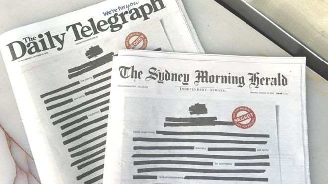 सोमबार अष्ट्रेलियाको सबैभन्दा ठूलो अखबार र अन्य अखबारहरुले एकजुटता देखाउँदै आफ्नो मुख्य पृष्ठमा लेखिएको सबै शब्दलाई कालो मसीले पोतिदिएका थिए । त्यसमाथि लालमोहर लगाइएको थियो, जसमा ‘सिक्रेट’ लेखिएको थियो ।