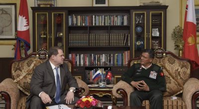 काठमाडौं – प्रधानसेनापति पूर्णचन्द्र थापासँग काठमाडौंस्थित रुसी राजदूतावासका नवनियुक्त राजदूत अलेक्जी ए.नोभिकोभले जङ्गी अड्डामा शिष्टाचार