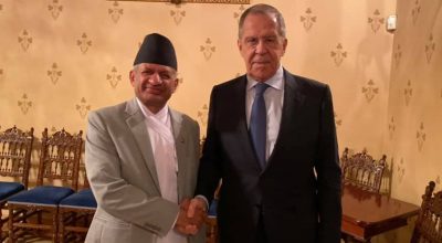 काठमाडौं – रुसको भ्रमणमा रहेका परराष्ट्रमन्त्री प्रदीप ज्ञवालीले रुसी समकक्षी सर्जेइ ल्याभ्रोभसँग भेटवार्ता गरेका छन्