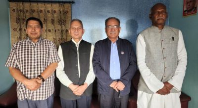 काठमाण्डु – नेकपा माओवादी केन्द्रका अध्यक्ष पुष्पकमल दाहाल प्रचण्डले बाबुराम भट्टराई र आफू सँगै उभिएकाे