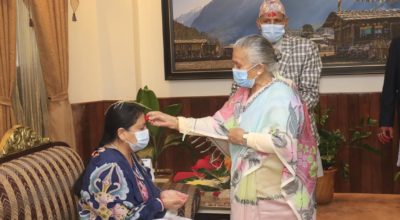 काठमाण्डु – राष्ट्रपति विद्यादेवी भण्डारीले दसैंको टीका ग्रहण गरेकी छिन् । राष्ट्रपति भण्डारीले शीतलनिवासमा आमा