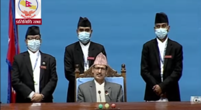 काठमाण्डु – प्रतिनिधिसभा बैठकमा एमाले सांसदहरूको नाराबाजी हुन थालेपछि सभामुख अग्निप्रसाद सापकोटालाई तीनजना मर्यादापालकले सुरक्षा