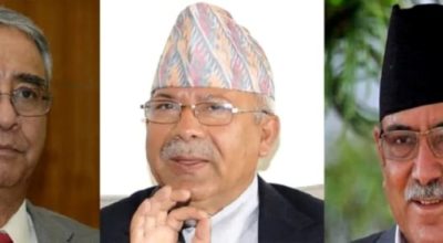 काठमाण्डु – प्रधानमन्त्री शेरबहादुर देउवा, नेकपा माओवादीका अध्यक्ष पुष्पकमल दाहाल प्रचण्ड र नेकपा एमाले समाजवादीका