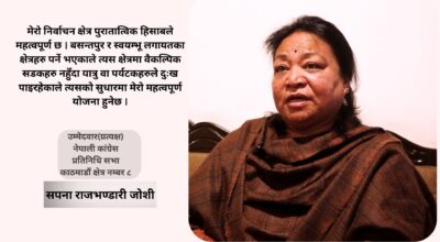 नेपाली कांग्रेसका दिवंगत नेता तथा पूर्वमन्त्री नवीन्द्रराज जोशीको धर्मपत्नी सपना राजभण्डारी जोशी काठमाण्ड–८ बाट प्रत्यक्षतर्फ