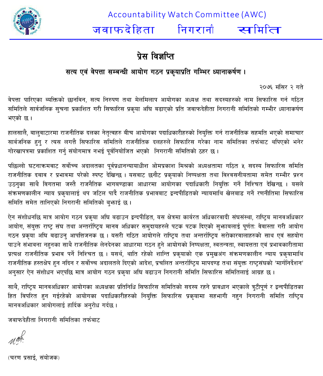 काठमाडौं – मानवअधिकारको क्षेत्रमा कार्यरत गैरसरकारी संस्थाहरूको समूह ‘जवाफदेहिता निगरानी समिति’ (एडब्लूसी) ले सत्य निरुपण तथा बेपत्ता सम्बन्धी आयोग गठन प्रक्रियाप्रति गम्भीर ध्यानाकर्षण भएको जनाएको छ ।