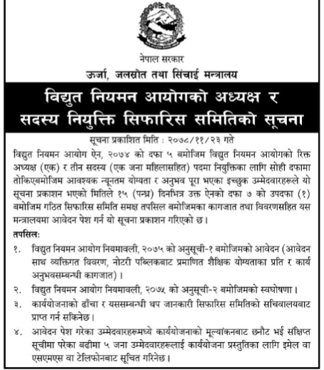 विद्युत नियमन आयोगमा अध्यक्ष र तीन सदस्यका लागि दरखास्त आह्वान