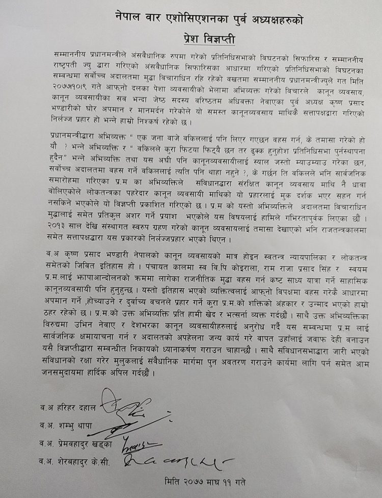 आइतबार वारका चार जना पूर्वअध्यक्षहरु हरिहर दहाल, शम्भु थापा, प्रेम बहादुर खड्का र शेरबहादुर केसीले एक विज्ञप्ति जारी गर्दै वरिष्ठ वकिल कृष्ण प्रसाद भण्डारीमाथि प्रधानमन्त्री अोलीले अपमान र मानमर्दन गरेको र अदालतका अपहेलान गरेको भन्दै कारबाहीका लागि अपील गरेका छन् ।
