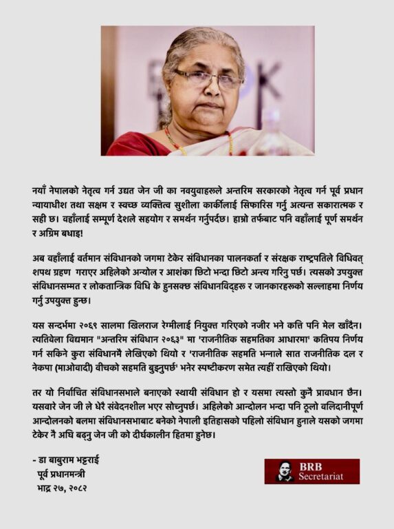 भट्टराईले शुक्रबार बिहान विज्ञप्ति जारी गरी भनेका छन् ‘नयाँ नेपालको नेतृत्व गर्न उद्यत जेनजीका नवयुवाहरूले अन्तरिम सरकारको नेतृत्व गर्न पूर्वप्रधानन्यायाधीश तथा सक्षम र स्वच्छ व्यक्तित्व सुशीला कार्कीलाई सिफारिस गर्नु अत्यन्त सकारात्मक र सही छ। उहाँलाई सम्पूर्ण देशले सहयोग र समर्थन गर्नुपर्दछ। हाम्रो तर्फबाट पनि उहाँलाई पूर्ण समर्थन र अग्रिम बधाई’ अब उहाँलाई वर्तमान संविधानको जगमा टेकेर संविधानका पालनकर्ता र संरक्षक राष्ट्रपतिले विधिवत् शपथ ग्रहण गराएर अहिलेको अन्योल र आशंका छिटोभन्दा छिटो अन्त्य गरिनुपर्छ। त्यसको उपयुक्त संविधानसम्मत र लोकतान्त्रिक विधि के हुन सक्छ, संविधानविद्हरू र जानकारहरूको सल्लाहमा निर्णय गर्नु उपयुक्त हुन्छ।’