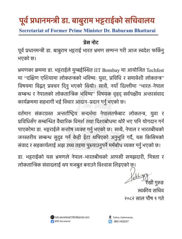 काठमाण्डु – पूर्वप्रधानमन्त्री डा. बाबुराम भट्टराई भारतको भ्रमण सम्पन्न गरी बुधबार स्वदेश फर्किएका छन् ।