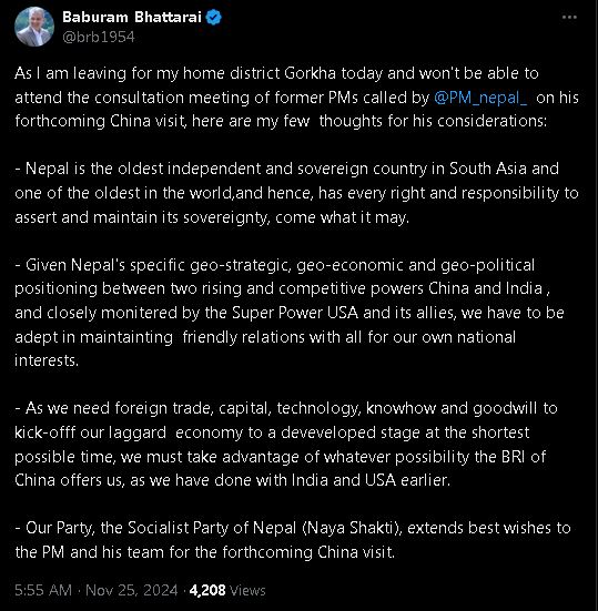आफ्नो चीन भ्रमणको विषयमा प्रधानमन्त्रीले बोलाएको बैठकमा अनुपस्थित हुने जनाउँदै भट्टराईले सामाजिक संजाल एक्समार्फत् प्रधानमन्त्री ओलीलाई सुझाव दिएका छन् । भट्टराईले नेपाल दक्षिण एसियाको सबैभन्दा पुरानो स्वतन्त्र र सार्वभौमसत्ता सम्पन्न राष्ट्र भएको उल्लेख गर्दै आफ्नो सार्वभौमसत्तालाई भ्रमणका क्रममा पनि ख्याल राख्न प्रधानमन्त्रीलाई सुझाव दिएका छन् ।