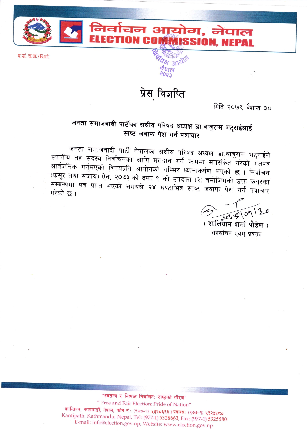 काठमाण्डु – निर्वाचन आयोगले जनता समाजवादी पार्टी (जसपा)का संघीय परिषद अध्यक्ष बाबुराम भट्टराईलाई स्पष्टीकरण सोधेको छ । मतदानको क्रममा स्वस्तिक छाप लगाइसकेको मतपत्र सामाजिक सञ्जालमार्फत सार्वजनिक गरेपछि उनलाई आयोगले २४ घण्टे स्पष्टीकरण सोधेको हो ।