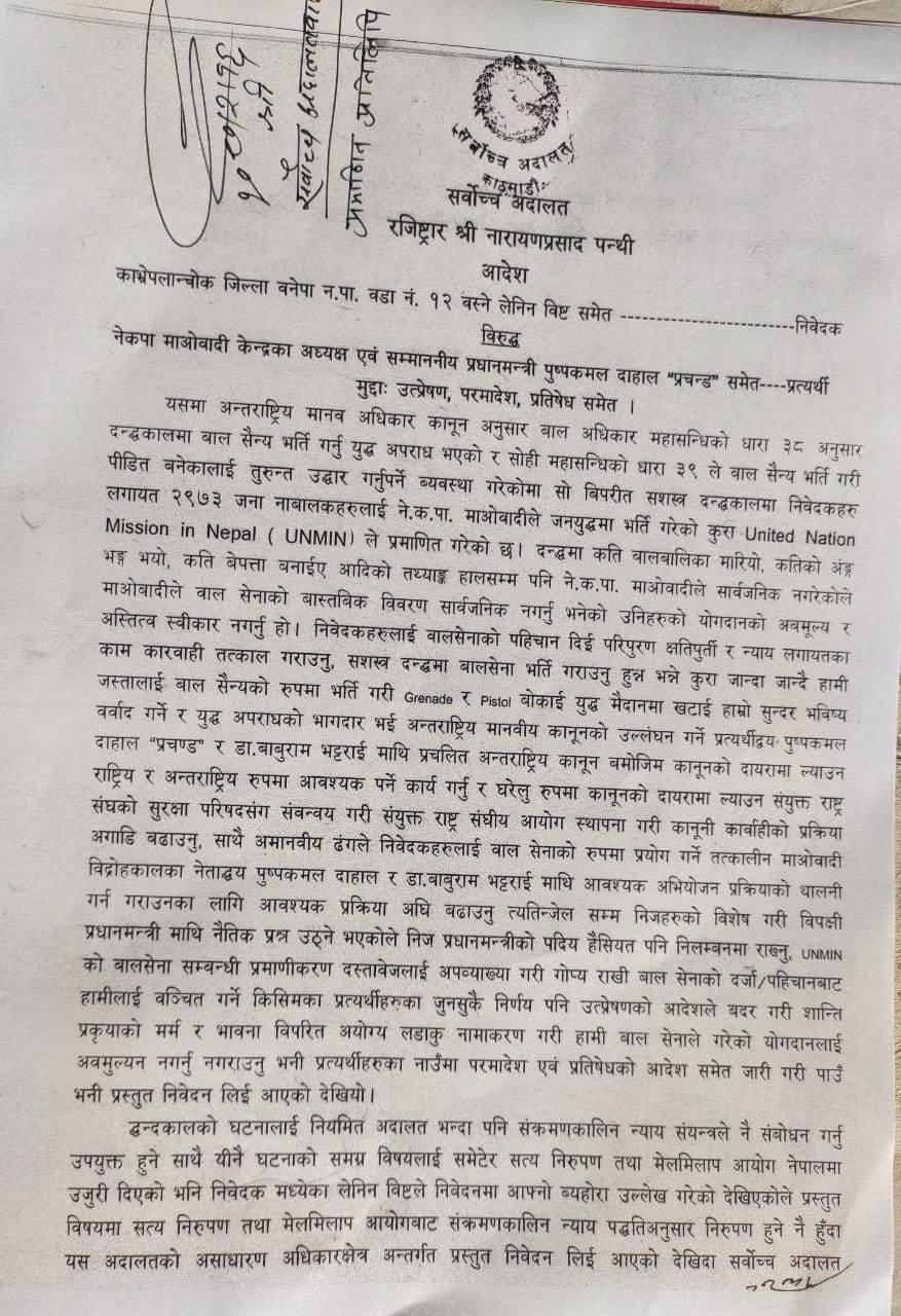 आफूहरुलाई बालावस्थामा युद्धमा प्रयोग गरेको भन्दै प्रचण्ड र भट्टराईविरुद्ध युद्ध अपराधको मुद्दा चलाइनुपर्ने जिकीर गर्दै विष्टसहितले शुक्रबार रिट निवेदन दिएका थिए । आफूहरुलाई बाल सेनाको दर्जाबाट बञ्चित गर्ने किसिमका कार्य नगर्नु भनि विपक्षीहरुका नाममा परमादेशको आदेश जारी गर्न पनि उनीहरुले माग गरेका थिए ।
