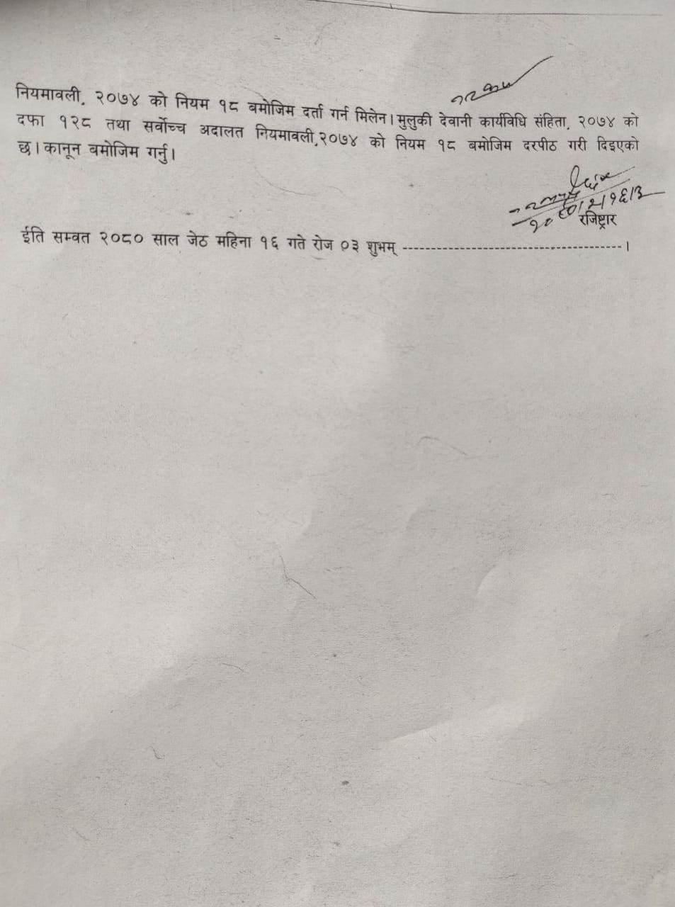 गत शुक्रबार प्रधानमन्त्री प्रचण्ड, डा भट्टराईविरुद्ध युद्ध अपराधको मुद्दा चलाएर कानुनी कारबाहीको दायरामा ल्याउन माग गर्दै लेलिन विष्टसमेतले दिएको रिट निवेदनलाई मंगलबार रजिष्ट्रार नारायाणप्रसाद पन्थीको आदेशमा दरपिठ गरिदिएको हो ।