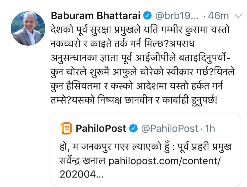 नवगठित जनता समाजवादी पार्टीका नेता समेत भट्टराईले टिवटरमा लेखेका छन् ‘देशको पूर्व सुरक्षा प्रमुखले यति गम्भीर कुरामा यस्तो नकच्चरो र काइते तर्क गर्न मिल्छ?अपराध अनुसन्धानका ज्ञाता पूर्व आईजीपीले बताइदिनुपर्यो-कुन चोरले शुरूमै आफुले चोरेको स्वीकार गर्छ?यिनले कुन हैसियतमा र कस्को आदेशमा यस्तो हर्कत गर्न तम्से?यसको निष्पक्ष छानवीन र कार्वाही हुनुपर्छ । ’
