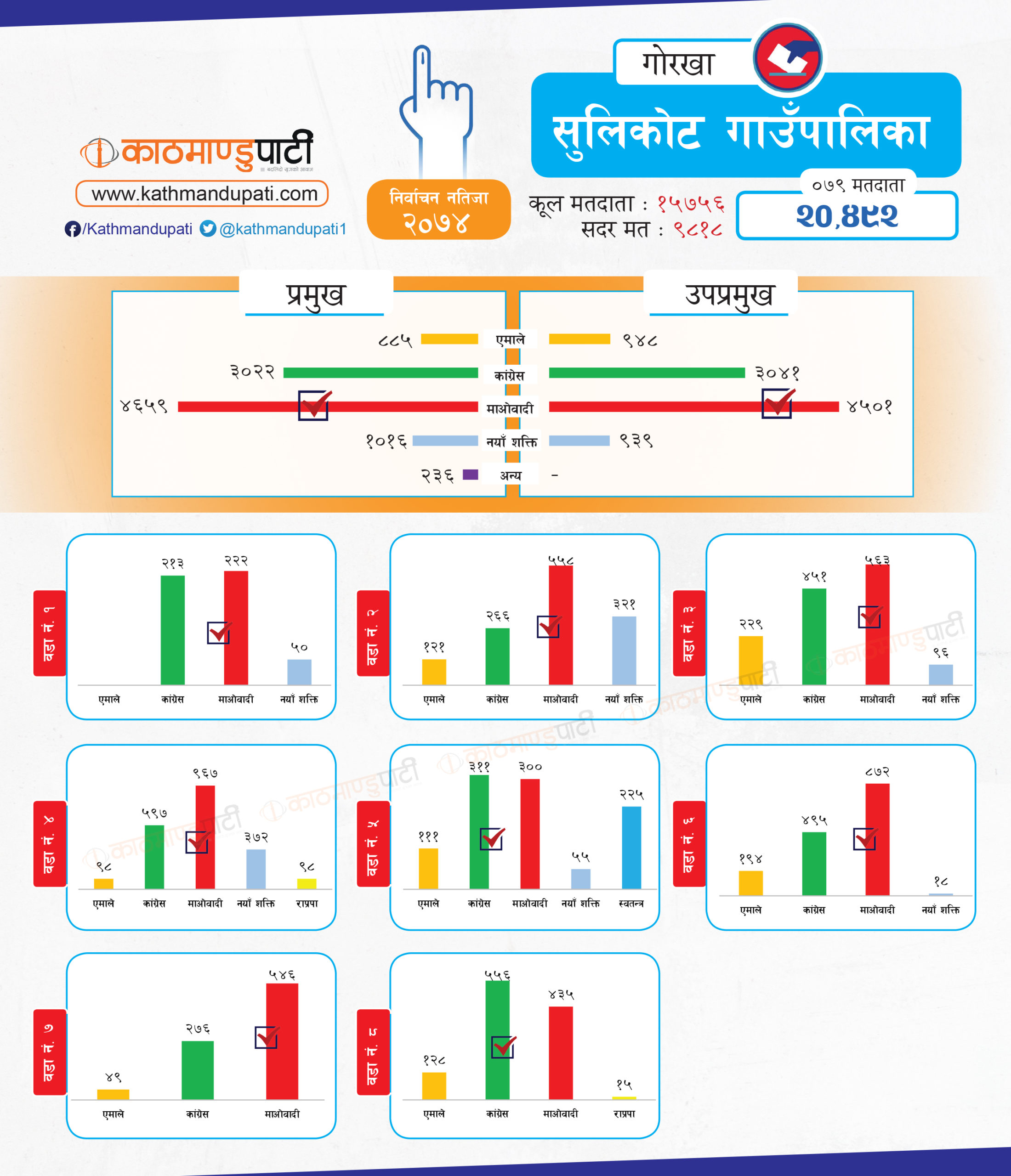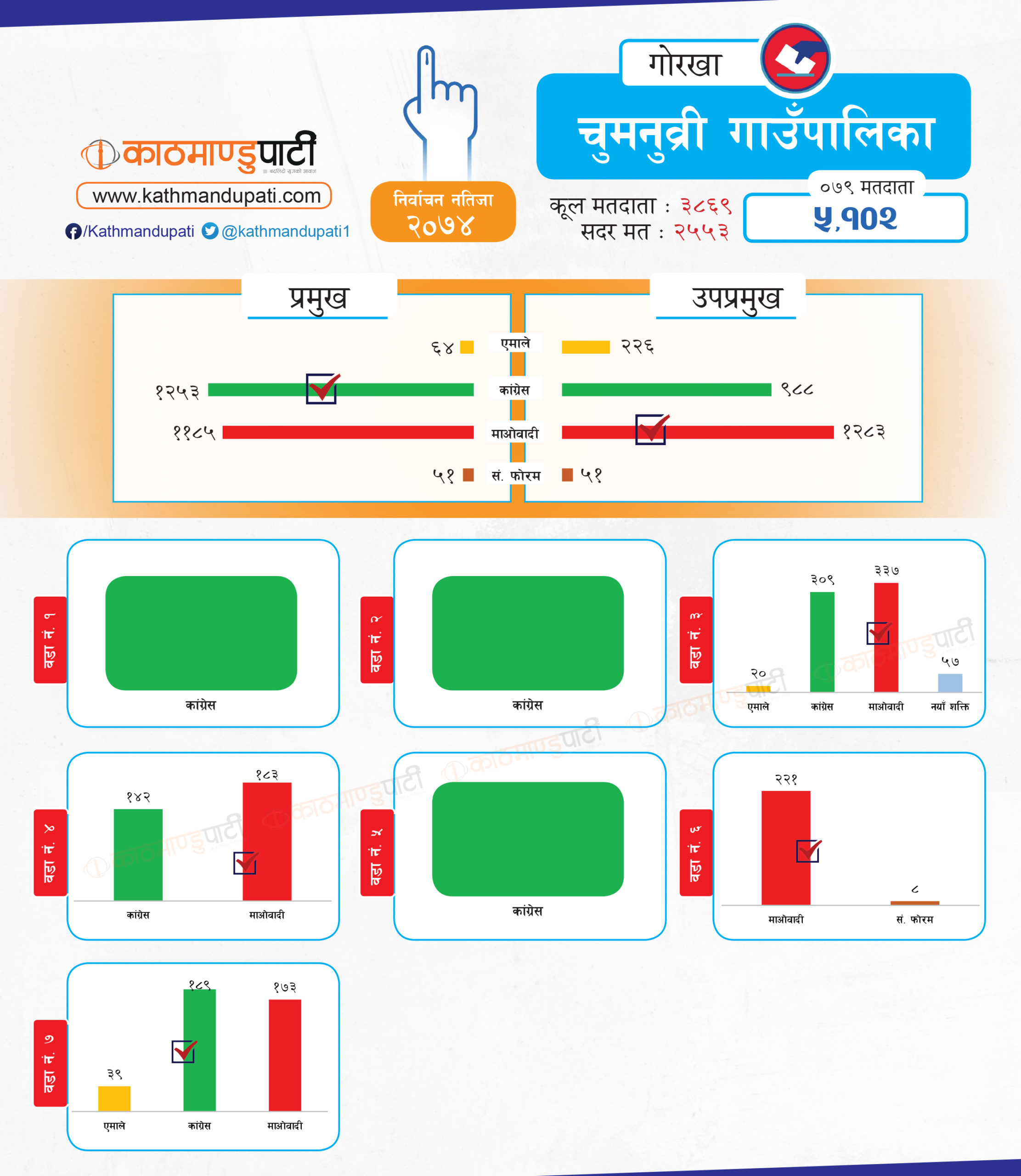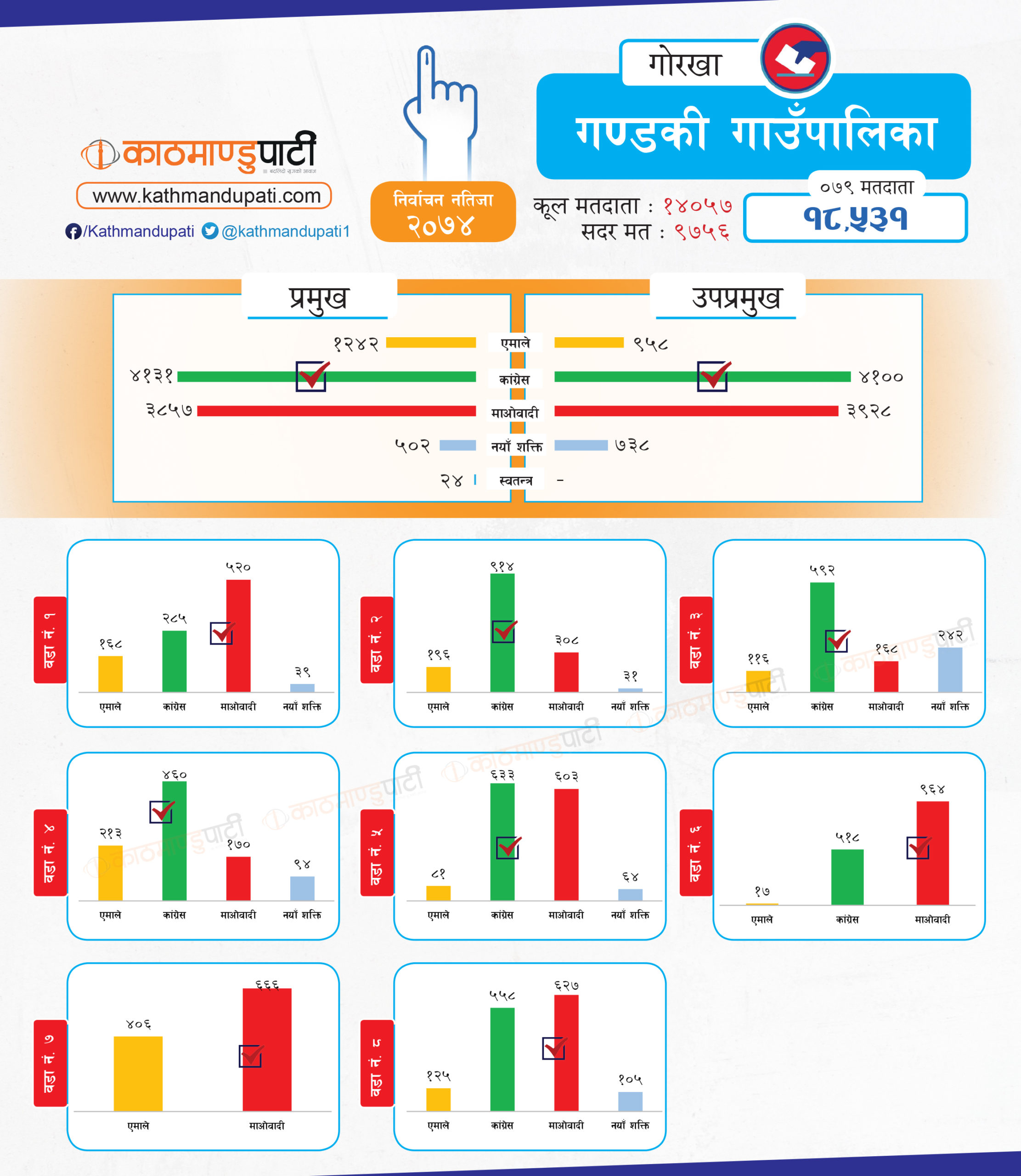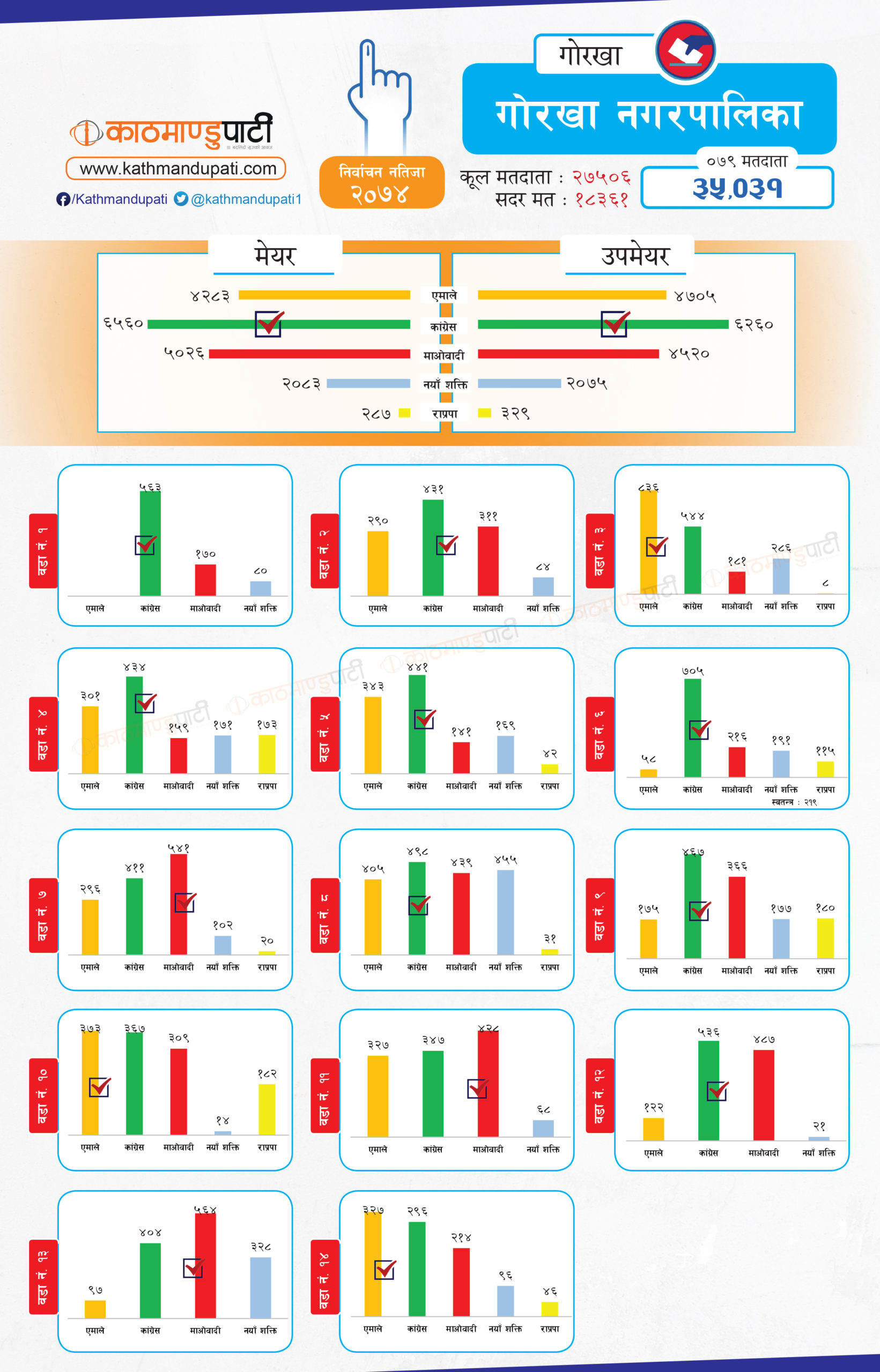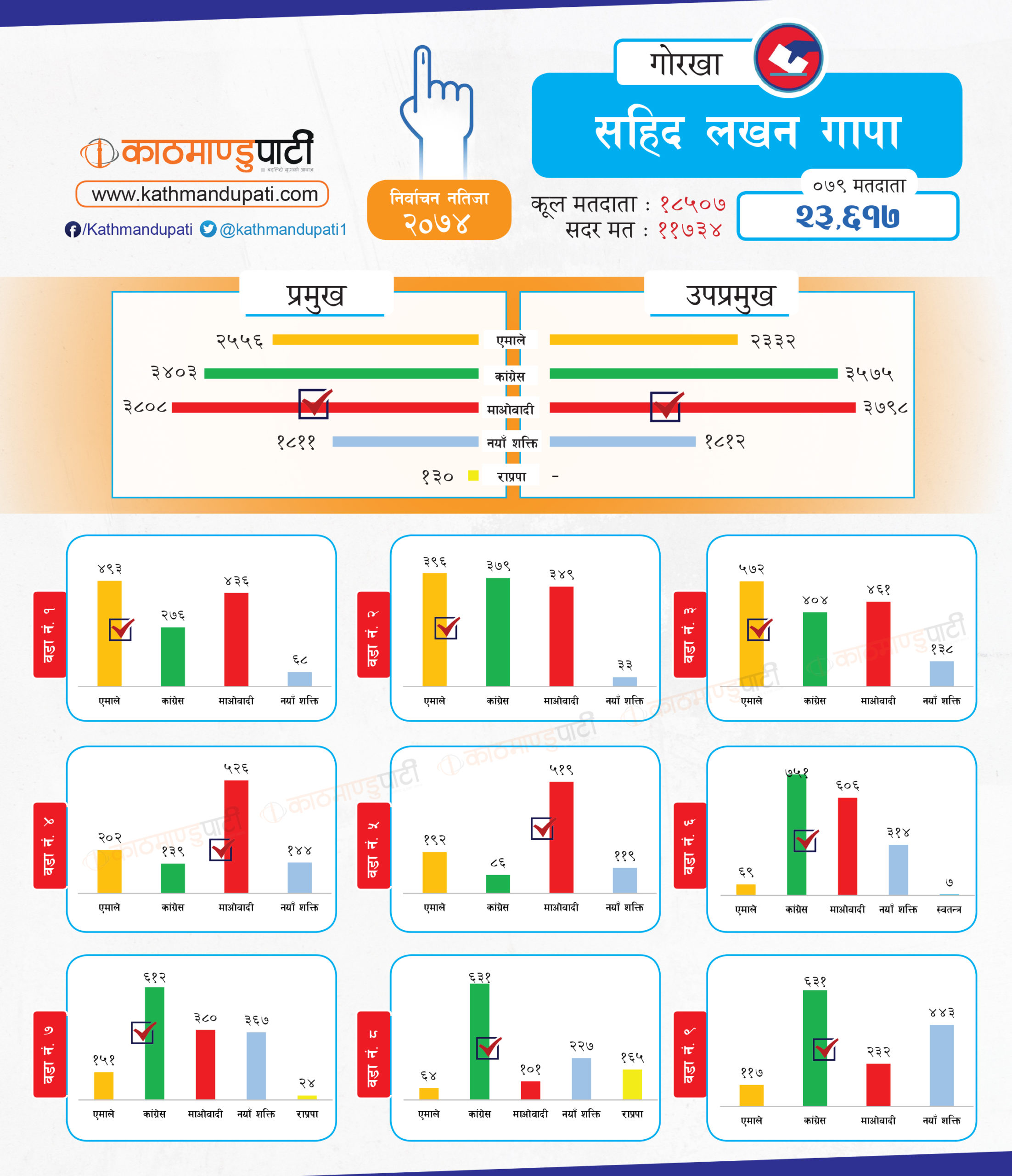 कांग्रेसले सदरमुकाम गोरखा नगरपालिकाको मेयर–उपमेयर, पालुङटार नगरपालिकाको मेयरसहित अजिरकोट, आरुघाट, गण्डकी, धार्चे, भीमसेन र सिरानचोक गाउँपालिकामा अध्यक्ष–उपाध्यक्ष तथा चुमनुब्रीमा अध्यक्ष जितेको थियो । माओवादीले सहिद लखन र सुलिकोट गाउँपालिकामा अध्यक्ष–उपाध्यक्ष तथा पालुङटार नगरपालिकामा उपमेयर र चुमनुब्रीमा उपाध्यक्ष जित्यो ।