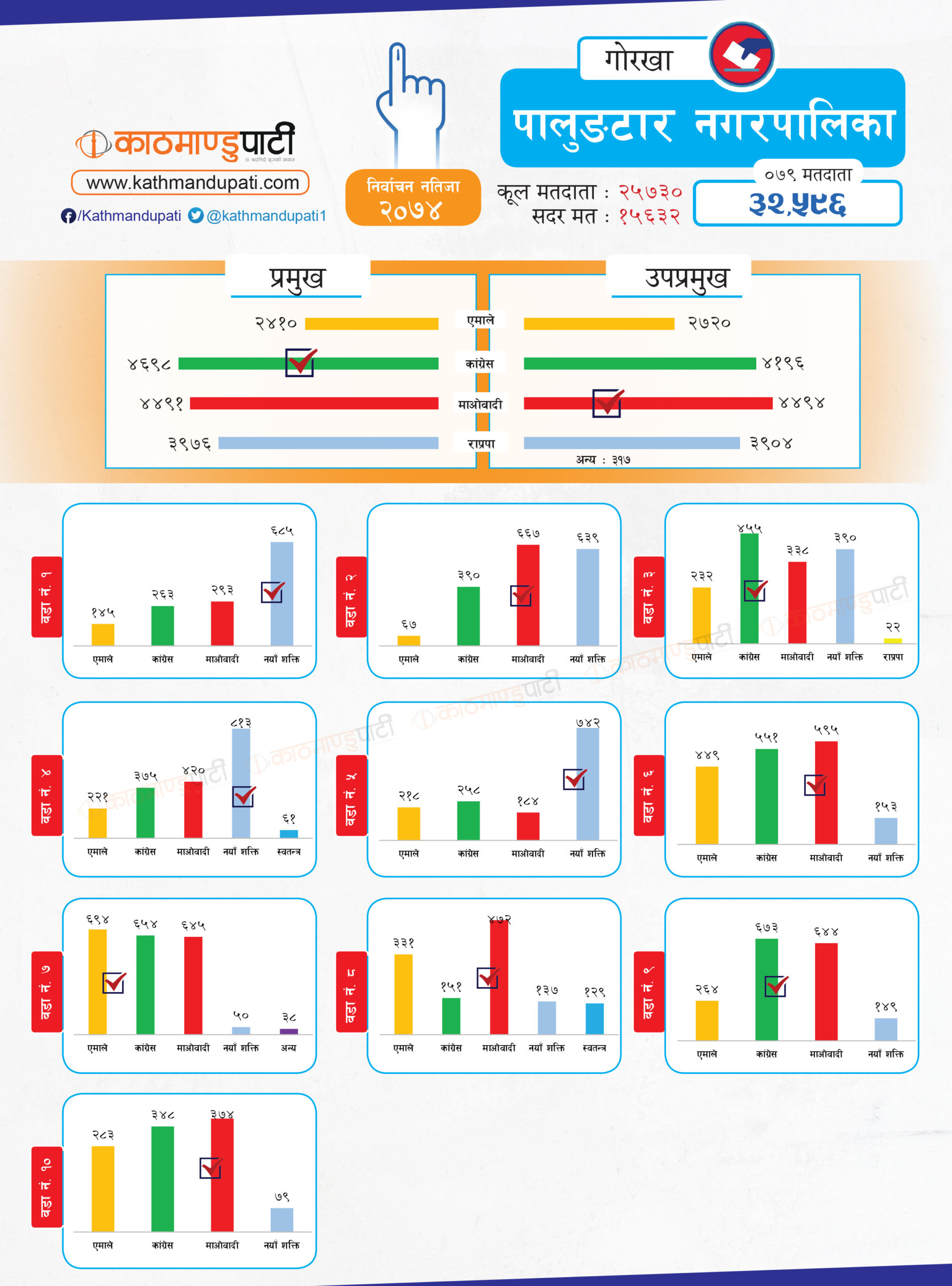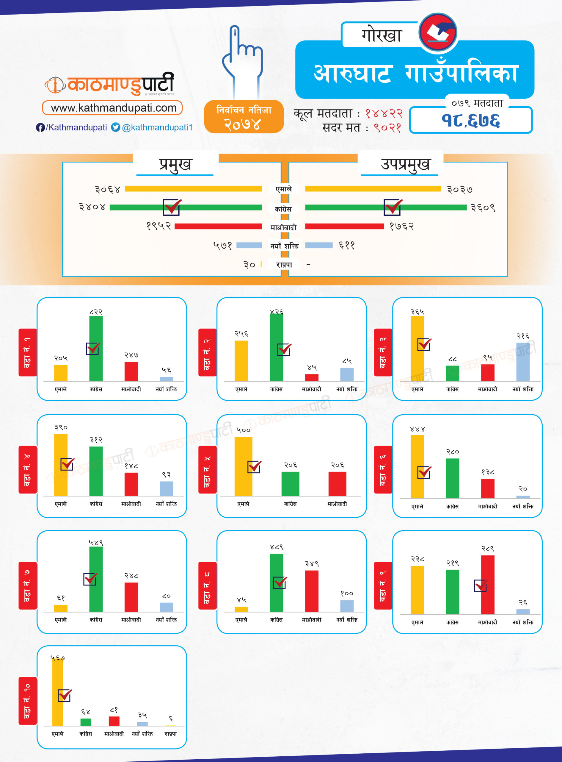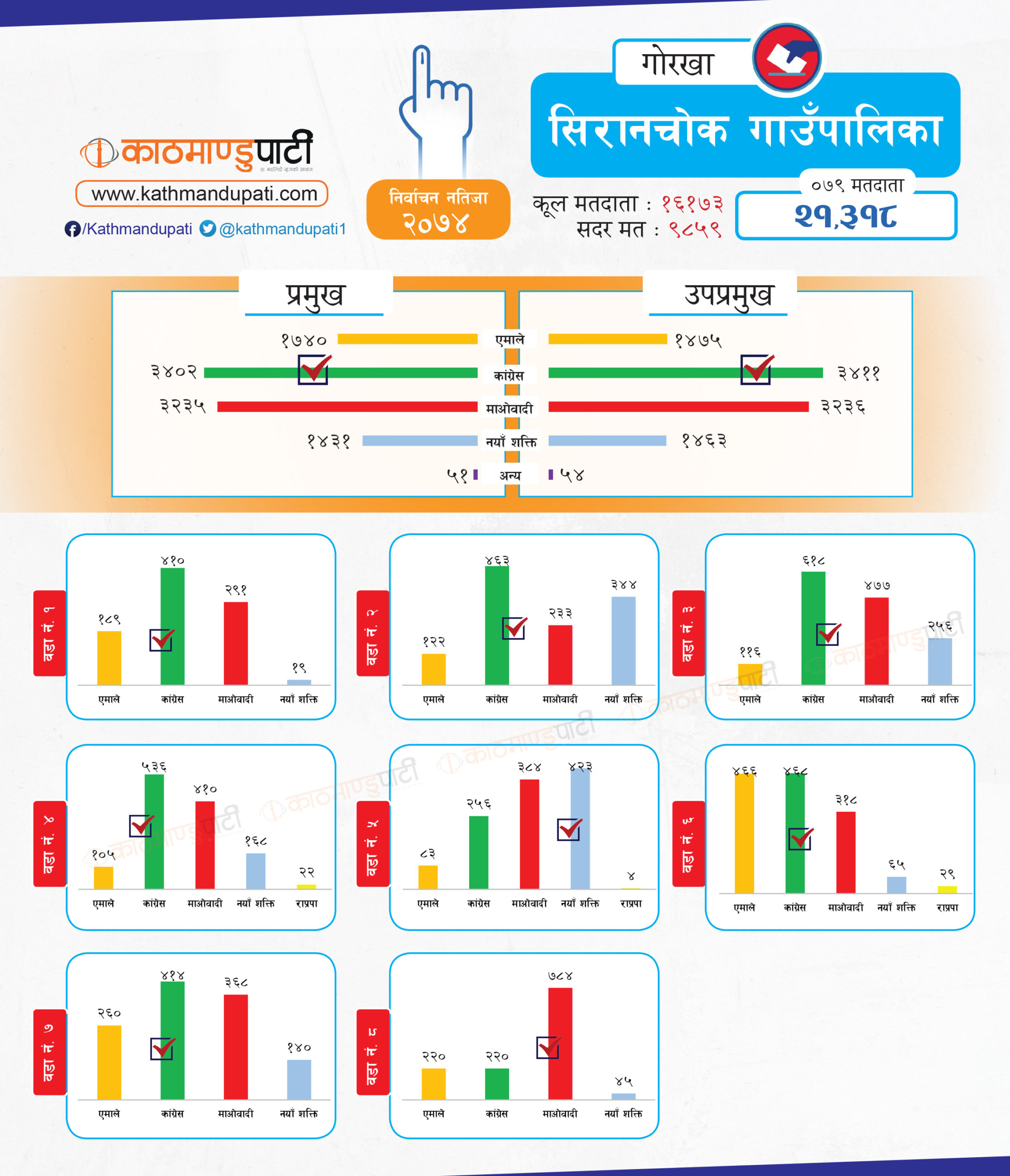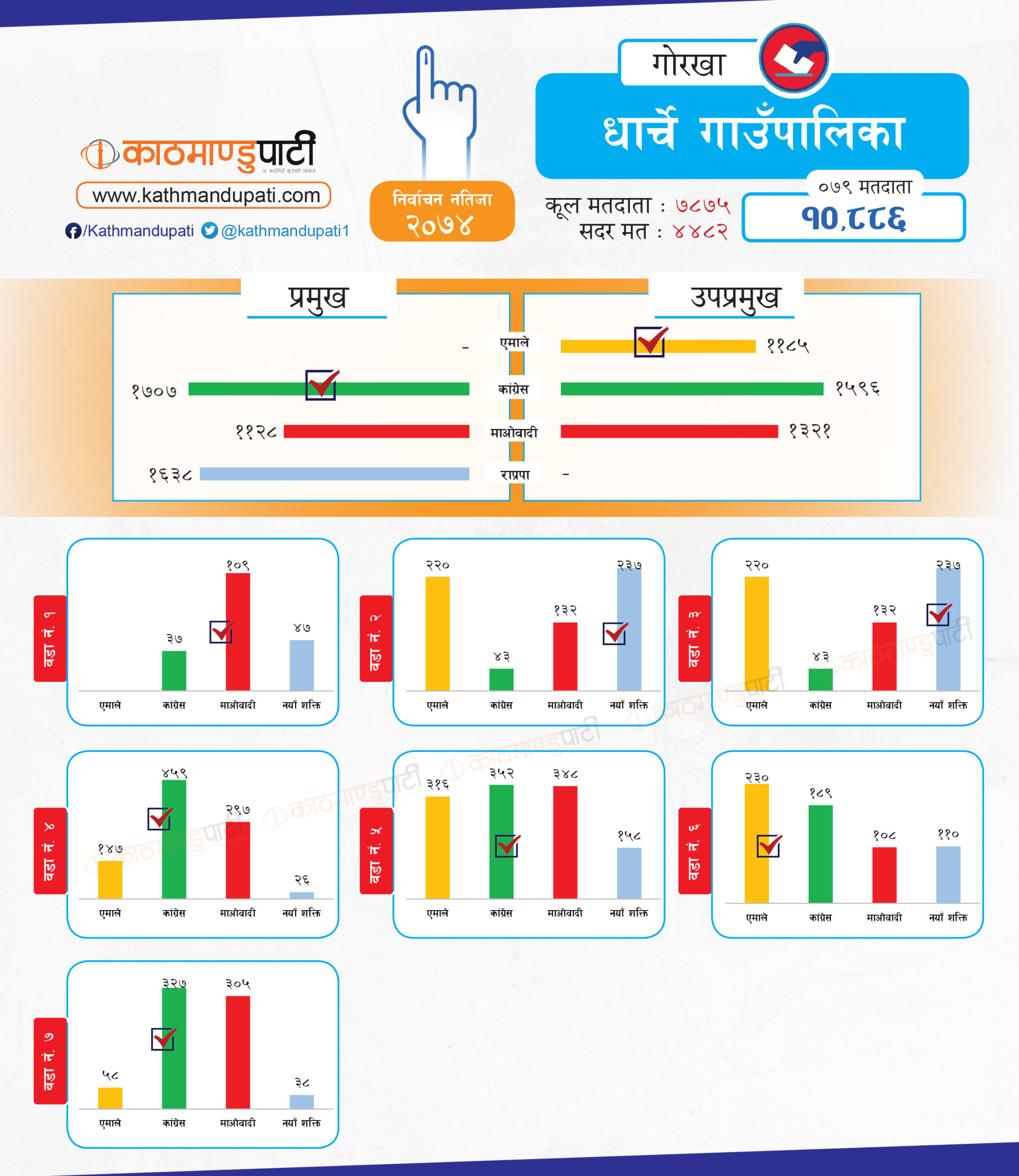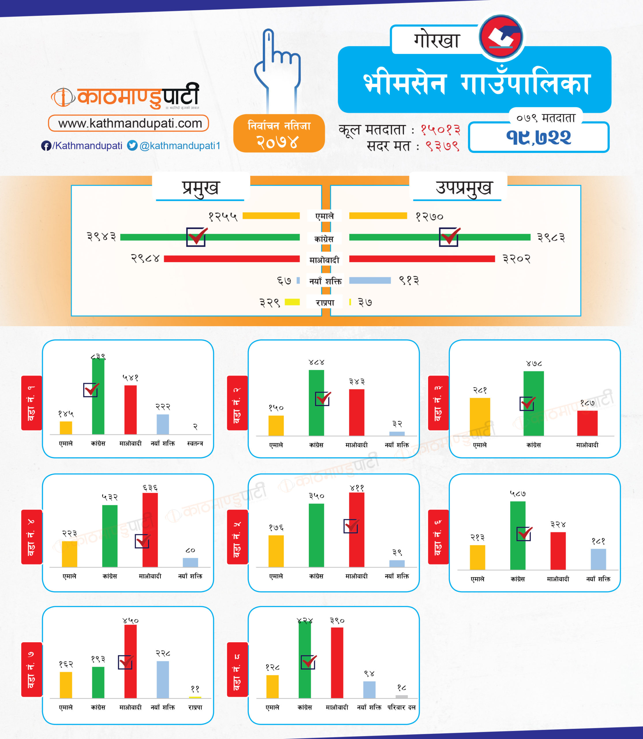 कांग्रेसले सदरमुकाम गोरखा नगरपालिकाको मेयर–उपमेयर, पालुङटार नगरपालिकाको मेयरसहित अजिरकोट, आरुघाट, गण्डकी, धार्चे, भीमसेन र सिरानचोक गाउँपालिकामा अध्यक्ष–उपाध्यक्ष तथा चुमनुब्रीमा अध्यक्ष जितेको थियो । माओवादीले सहिद लखन र सुलिकोट गाउँपालिकामा अध्यक्ष–उपाध्यक्ष तथा पालुङटार नगरपालिकामा उपमेयर र चुमनुब्रीमा उपाध्यक्ष जित्यो ।