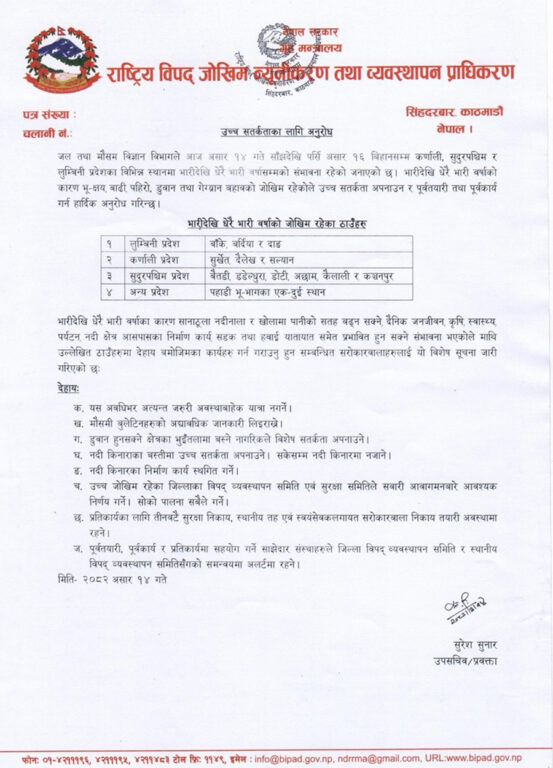 ठूलो वर्षाका कारण ती ठाउँमा भूक्षय, बाढी, पहिरो, डुबान तथा गेग्य्रान बहावको जोखिम रहेकाले उच्च सतर्कता अपनाउन प्राधिकरणको सल्लाह छ ।
