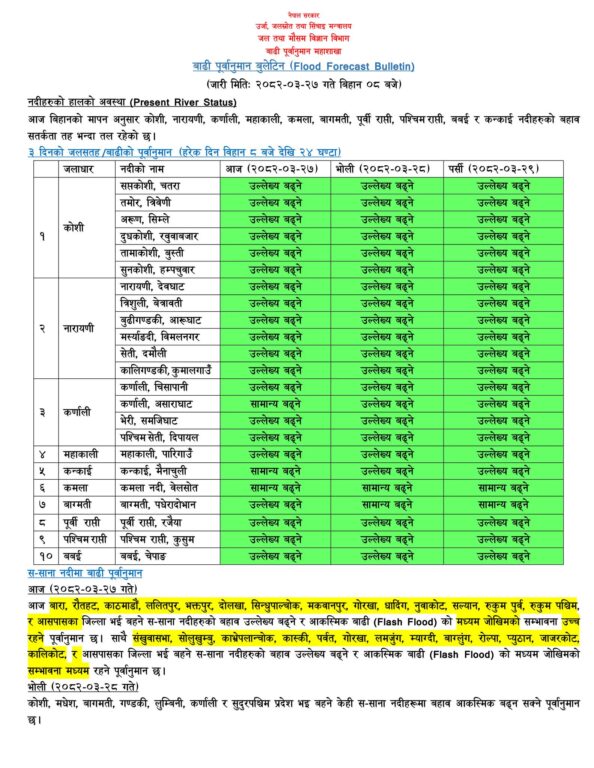 शुक्रबार बिहानको मापनानुसार कोसी, नारायणी, कर्णाली, महाकाली, कमला, वाग्मती, पूर्वी राप्ती, पश्चिम राप्ती, बबई र कन्काई नदीको बहाव सतर्कता तहभन्दा तल रहेको महाशाखाले जनाएको छ ।