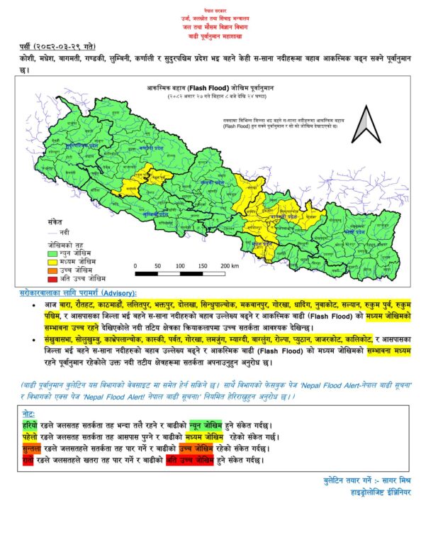 बारा, रौतहट, काठमाण्डु , ललितपुर, भक्तपुर, दोलखा, सिन्धुपाल्चोक, मकवानपुर, गोरखा, धादिङ, नुवाकोट, सल्यान, रुकुम पूर्व र रुकुम पश्चिममा आकस्मिक बाढीको मध्यम जोखिमको सम्भावना उच्च रहने औँल्याइएको छ । यी जिल्ला भई बहने साना नदीमा बहाव उल्लेख्य बढ्ने महाशाखाको पूर्वानुमान छ ।