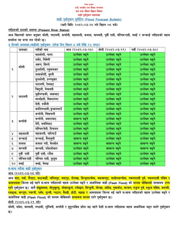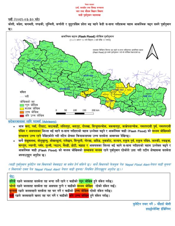 साथै संखुवासभा, सोलुखुम्बु, ओखलढुंगा, रामेछाप, सिन्धुली, गोरखा, धादिङ, नुवाकोट, सल्यान, रुकुमपूर्व, रुकुमपश्चिम, कास्की, स्याङ्जा, बागलुङ, म्याग्दी, पर्वत, गुल्मी, प्यठान, बैतडी, डोटी, बझाङ र आसपासका जिल्ला भई बहने ससाना नदीको बहाब उल्लेख्य बढ्ने र आकस्मिक बाढीको मध्यम जोखिम हुने सम्भावना पनि मध्यम नै रहेको बाढी महाशाखाले जनाएको छ।