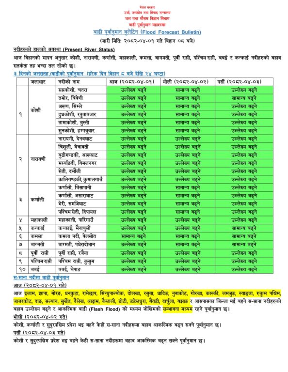 बाढी महाशाखाका अनुसार बिहीबार बाढी मापन गर्दा कोसी, नारायणी, कर्णाली, महाकाली, कमला, बागमती, पूर्वी राप्ती, पश्चिम राप्ती, बबई र कन्काई नदीको बहाब सतर्कता तहभन्दा तलै छ तर बढ्ने सम्भावना छ।