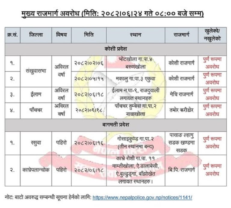 यस्तै मेची राजमार्गको इलाम खण्ड र तमोर कोरिडोर पनि पहिरोको कारण अवरुद्ध रहेका छन् ।