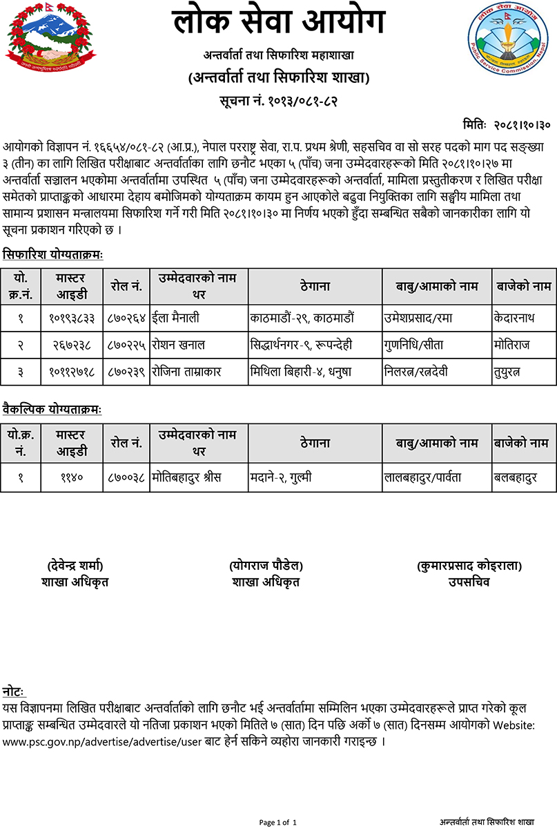 आयोगले बुधबार प्रकाशित गरेको अन्तर्वार्ताको नतिजाअनुसार उपसचिवहरू ईला मैनाली, रोशन खनाल र रोजिना ताम्राकारको नाम सहसचिवमा बढुवाका लागि सिफारिस भएको हो ।