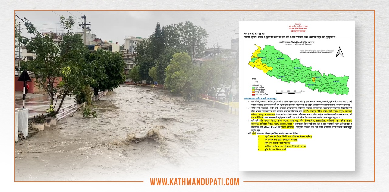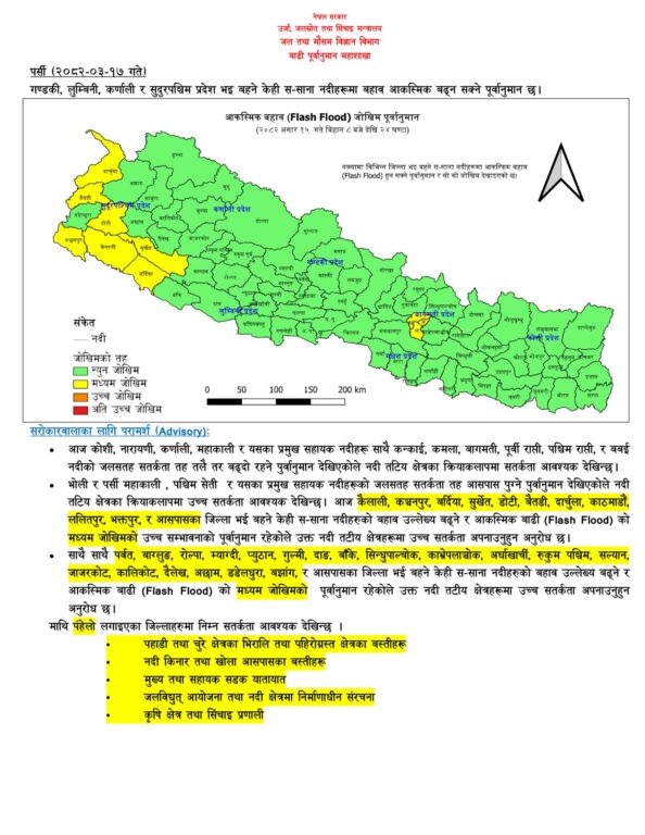 आज कैलाली, कञ्चनपुर, बर्दिया, सुर्खेत, डोटी, बैतडी, दार्चुला, काठमाडौँ, ललितपुर, भक्तपुर र आसपासका जिल्ला भई वहने केही ससाना नदीको बहाब उल्लेख्य बढ्ने र आकस्मिक बाढीको मध्यम जोखिम रहेको महाशाखाले जनाएको छ ।