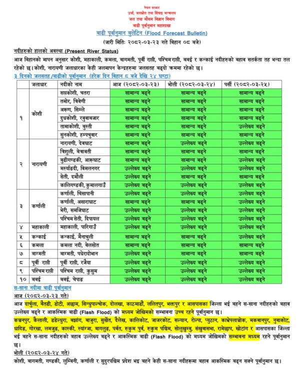 आज दार्चुला, बैतडी, डोटी, अछाम, सिन्धुपाल्चोक, दोलखा, काठमाण्डु, ललितपुर, भक्तपुर र आसपासका जिल्ला भई बहने स–साना नदीहरुको बहाव उल्लेख्य बढ्ने र आकस्मिक बाढीको सम्भावना उच्च रहने पूर्वानुमान छ।
