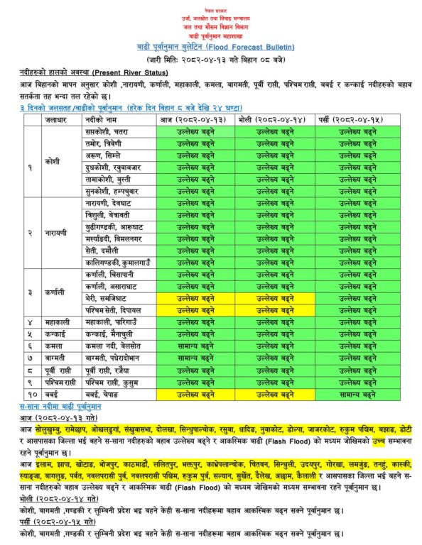 आज सोलुखुम्बु, रामेछाप, ओखलढुङ्गा, संखुवासभा, दोलखा, सिन्धुपाल्चोक, रसुवा, धादिङ, नुवाकोट, डोल्पा, जाजरकोट, रुकुम पश्चिम, बझाङ, डोटी र आसपासका जिल्ला भई बहने स–साना नदीहरुको बहाव उल्लेख्य बढ्ने र आकस्मिक बाढीको सम्भावना उच्च रहेको छ ।