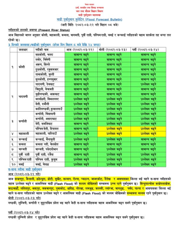 आज कञ्चनपुर, कैलाली, डडेल्धुरा, डोटी, सुर्खेट, सल्यान, रोल्पा, प्याठान, जाजरकोट, दैलेख र आसपासका जिल्ला भई बहने स–साना नदीहरुको बहाव उल्लेख्य बढ्ने र आकस्मिक बाढीको सम्भावना उच्च रहने छ ।