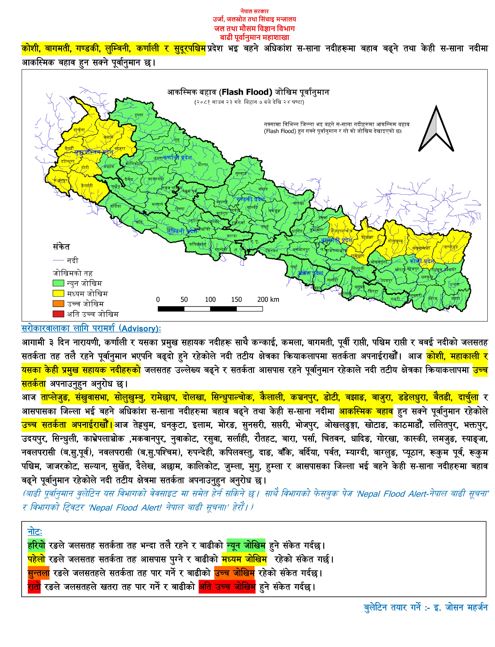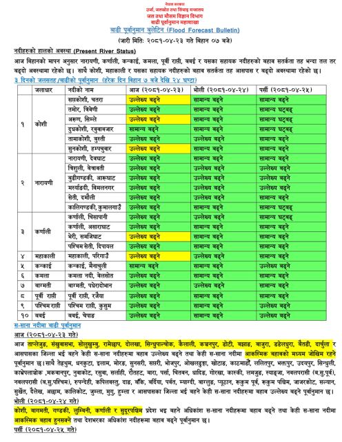 आज ताप्लेजुङ, संखुवासभा, सोलुखुम्बु, रामेछाप, दोलखा, सिन्धुपाल्चोक, कैलाली, कञ्चनपुर, डोटी, बझाङ, बाजुरा, डडेलधुरा, बैतडी, दार्चुला र आसपासका जिल्ला भई बहने अधिकांश नदीमा बहाव बढ्ने तथा केहीमा आकस्मिक बहाव बढ्न सक्ने अनुमान महाशाखाकाे रहेकाे छ।