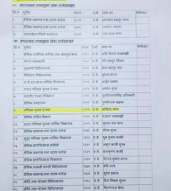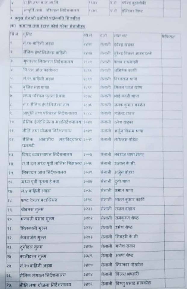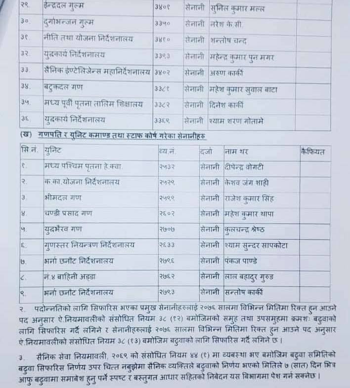 उनीहरुको रिक्त स्थानमा बढुवा हुने सेनाले जनाएको छ । प्रधानसेनापति पूर्णचन्द्र थापाले चैत २१ मा बढुवा समितिले गरेको सैनिक अधिकृतहरुको बढुवा सदर गरेका हुन् ।