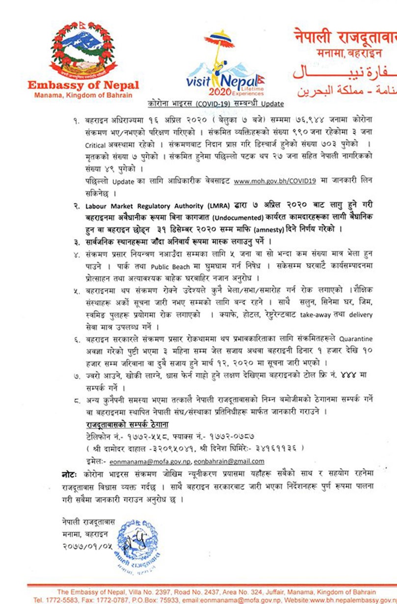 बहराइनमा अहिलेसम्म ९९० जनामा संक्रमण देखिएको छ । ७ जनाको मृत्यु भएको छ ।