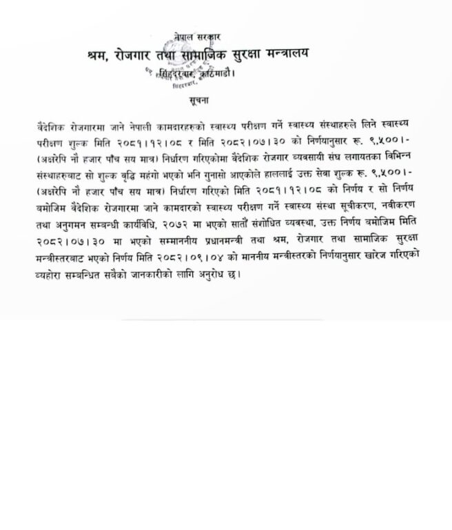 काठमाण्डु – वैदेशिक रोजगारीमा जानेहरूको स्वास्थ्य परीक्षण शुल्क वृद्धि खारेज भएको छ । श्रम, रोजगार तथा सामाजिक सुरक्षा मन्त्री राजेन्द्रसिंह भण्डारीले शुल्क वृद्धि खारेज गर्दै पुरानै यथावत् गराएका हुन् ।