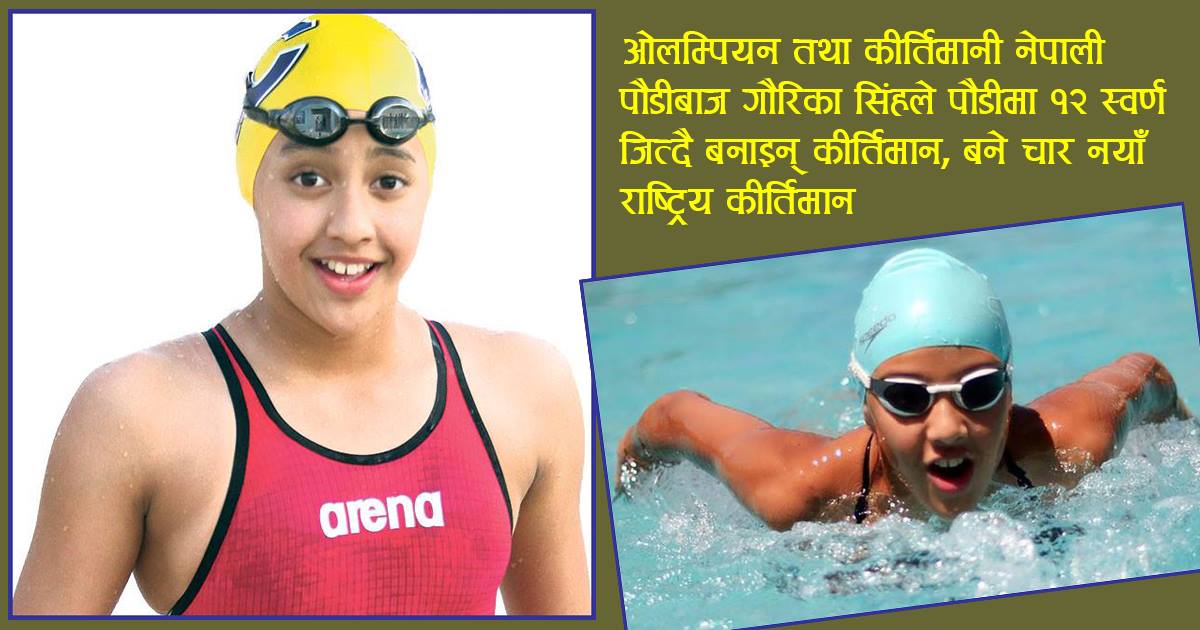 नेपालगञ्ज – ओलम्पियन तथा कीर्तिमानी नेपाली पौडीवाज गौरिका सिंहले आठौं राष्ट्रिय पौडी च्याम्पियनमा १२ स्वर्ण जित्दै कीर्तिमान बनाएकी छन् । उनले चारवटा नयाँ राष्ट्रिय कीर्तिमान पनि बनाइन्। पदकको दृष्टिकोणले उनी आठौँ राष्ट्रिय खेलकुदको सबैभन्दा सफल खेलाडी बनेकी छिन्। नेपालगन्जको एउटा प्रतिस्पर्धा जितेपछि उनले भनिन, “मेरो बुवाको घर बझाङ हो। त्यसैले आफ्नै घरमा आएर खेलेझैँ महसुस भइरहेको छ।“ लण्डनमा बस्ने गौरिकाको नेपाली खेलकुद क्षेत्रमा विशेष परिचय बनेको छ ।