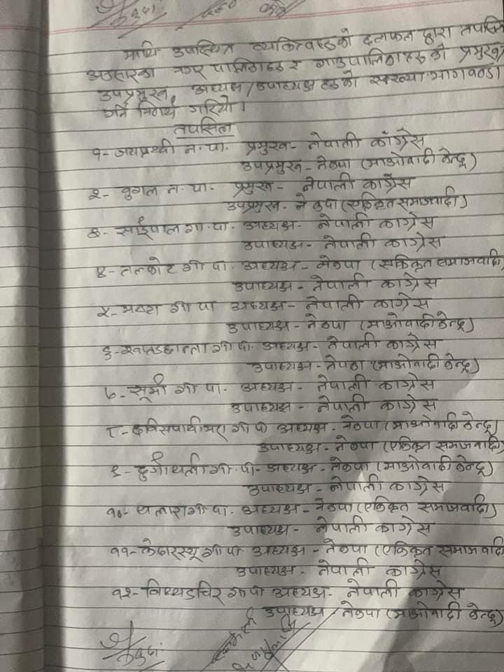 यसैगरी नकपा माओवादी केन्द्रले छबिसपाथिभेरा गाउँपालिका र दुर्गाथली गाउँपालिकामा नेतृत्व पाउने सहमति भएको हो । एकीकृत समाजवादी पार्टीले बझाङको तलकोट गाउँपालिका, केदारस्युँ गाउँपालिका र थलारा गाउँपालिकाको प्रमुख पदमा आफ्ना उम्मेदवार छनोट गर्ने सहमति भएको छ ।