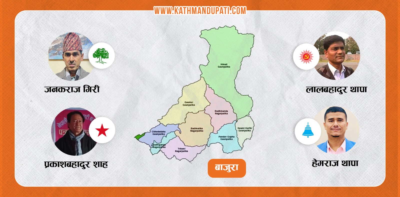 बाजुरामा अहिले मुख्य चार राजनीतिक दल प्रतिस्पर्धामा देखिएका छन् । कांग्रेसका गिरीसगै नेकपा एमालेका लाल बहादुर थापा, नेपाली कम्युनिष्ट पार्टीका प्रकाश बहादुर शाह र राष्ट्रिय स्वतन्त्र पार्टी (रास्वपा)का हेमराज थापा मुख्य प्रतिस्पर्धामा छन् । कांग्रेस र एमालेलाई जित हासिल गर्न भने हम्मेहम्मे हुने संकेत देखिएको छ ।