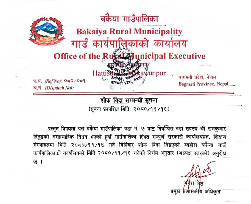 बकैयाका प्रमुख प्रशासकीय अधिकृत महेश श्रेष्ठद्वारा जारी सूचनामा वडा सदस्य तितुङको असामयिक निधन भएका कारण गाउँपालिकास्थित सम्पूर्ण सरकारी कार्यालय र शिक्षण संस्थामा बिहीबार शोक बिदा दिइएको जनाइएको छ ।