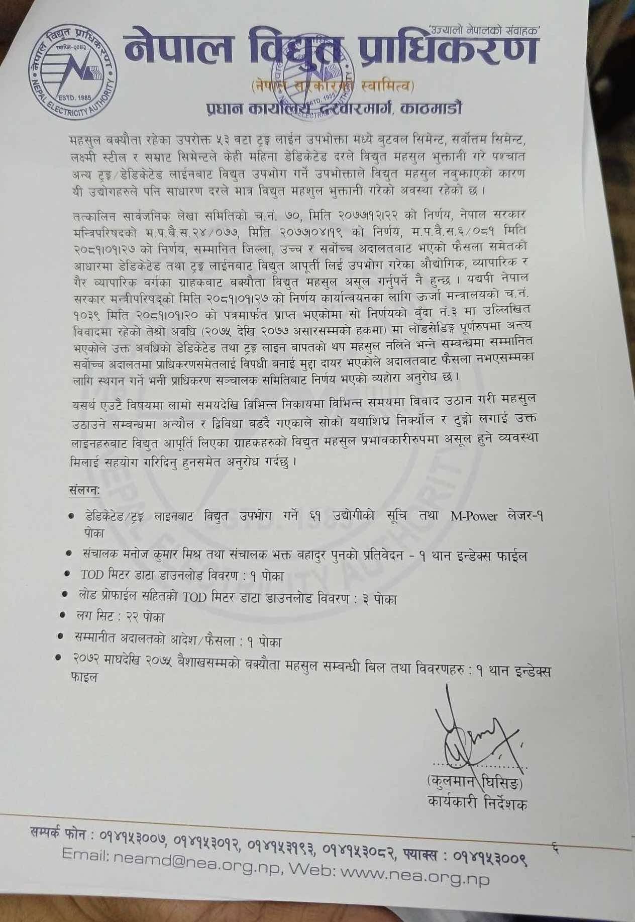 लेखा समितिले गत सोमबार बक्यौता रहेका उद्योगहरुको टीओडी मिटरको सबै विवरण बुझाउन प्राधिकरणलाई पत्र काटेको थियो।