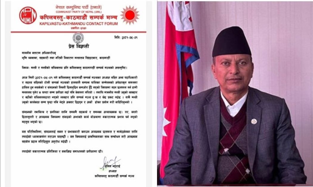 एमालेको कपिलवस्तु–काठमाडौं सम्पर्क मञ्चका अध्यक्ष सुनिल भट्टराईले विज्ञप्ति जारी गर्दै सोमबार (हिजो) मन्त्रालयमा चार घन्टा कुर्दा पनि मन्त्री अधिकारीले नभेटेको बताएका छन् । उनले मन्त्री अधिकारीको त्यो घटनाबारे दुःख व्यक्त गरेका हुन् ।