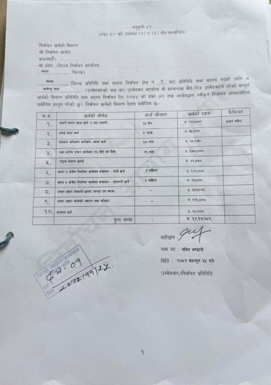 जसमा मनोनयनका लागि १० हजार, सवारी साधन भाडा २ लाख ९३ हजार ५००, हवाइ भाडा ३५ हजार, मतदाता प्रशिक्षण कार्यक्रम खाना खर्च २९ हजार ३९०, वडा स्तरीय प्रचार कार्यक्रमका लागि खाजा खर्च २८ हजार ९७०, प्रचार कार्यक्रमका लागि ५ लाख ८० हजार भएको उल्लेख गरेका छन्।