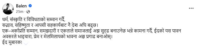 इद उल फित्रको अवसरमा सामाजिक सञ्जाल फेसबुकमा लेख्दै बालेनले धर्म, संस्कृति र विविधताको सम्मान गर्दै सद्भाव, सहिष्णुता र आपसी सहकार्यबाट नै देश अघि बढ्ने बताएका हुन् ।