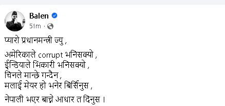 सामाजिक सञ्जाल फेसबुकमा मेयर बालेनले लेखेका छन्, ‘प्यारो प्रधानमन्त्रीज्यू, अमेरिकाले भ्रष्ट भनिसक्यो, इन्डियाले भिखारी भनिसक्यो, चीनले मान्छे गन्दैन, मलाई मेयर हो भनेर बिर्सिनुस्, नेपाली भएर बाँच्ने आधार त दिनुस् ।’