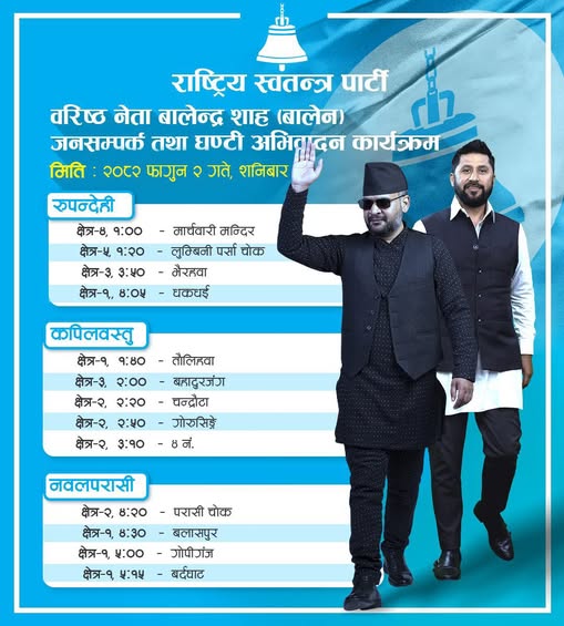शनिबार उनी रुपन्देही, कपिलवस्तु र नवलपरासीमा आयोजना हुने नागरिक तथा पार्टी कार्यकर्ता भेटघाट कार्यक्रममा सहभागि हुनेछन् । बालेनले शुक्रबार गोरखा बजारमा चुनावी कार्यक्रम गरेका थिए ।