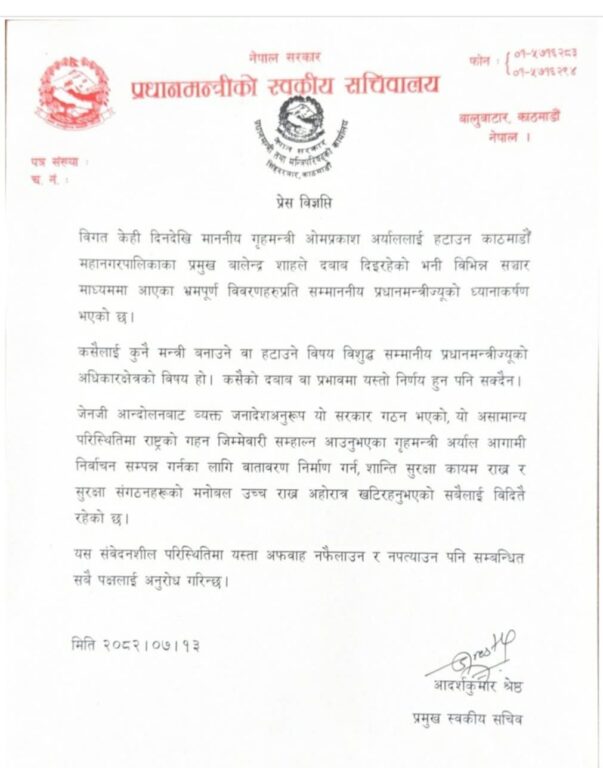 विगत केही दिनदेखि गृहमन्त्री अर्याललाई हटाउन काठमाण्डु महानगरपालिकाका प्रमुख बालेन्द्र शाहले दबाब दिइरहेको भनी विभिन्न सञ्चार माध्यममा आएका भ्रमपूर्ण विवरणप्रति सचिवालयले ध्यानाकर्षण भएको जनाउँदै कसैलाई कुनै मन्त्री बनाउने वा हटाउने विषय विशुद्ध प्रधानमन्त्रीको अधिकारक्षेत्रको विषय रहको स्पष्ट पार्यो ।