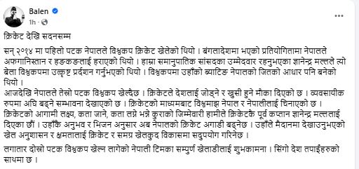 उनले क्रिकेटको आगामी दिशा, लक्ष्य र रणनीतिक जिम्मेवारी पूर्वकप्तान ज्ञानेन्द्र मल्ललाई दिइएको उल्लेख गर्दै मल्लको अनुभव, अनुशासन र नेतृत्व क्षमताले नेपाली क्रिकेट मात्र होइन, समग्र खेलकुद विकासमा योगदान पुर्याउने विश्वास व्यक्त गरेका छन्।