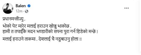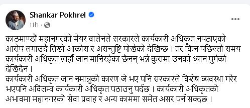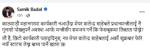 उनले लेखेका छन्, ‘काठमाडौँ महानगरको मेयर बालेनले सरकारले कार्यकारी अधिकृत नपठाएको आरोप लगाउँदै तिखो आक्रोश र असन्तुष्टि पोखेको देखिन्छ । तर किन पछिल्लो समय कार्यकारी अधिकृत त्यहाँ जान मानिरहेका छैनन् भन्ने कुरामा उनको ध्यान पुगेको देखिँदैन ।’