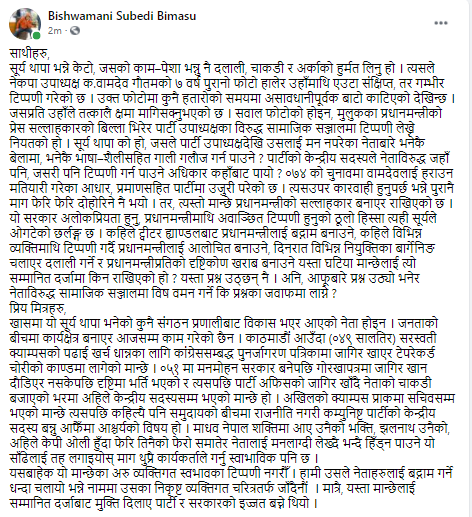 यस्तो छ सुवेदीको फेसबुक स्टाटस-