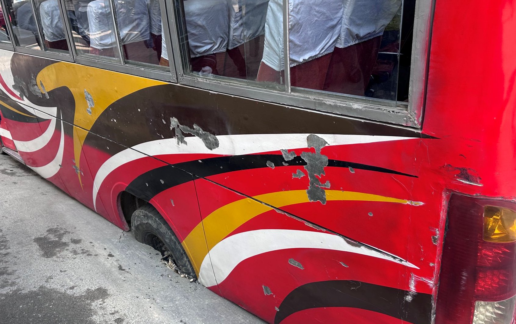 सर्भिस लेनतर्फको सडक भासिएर चक्का फसेपछि बस कोल्टे परेको छ । यात्रुहरू भने बाहिर निस्किएका छन् ।